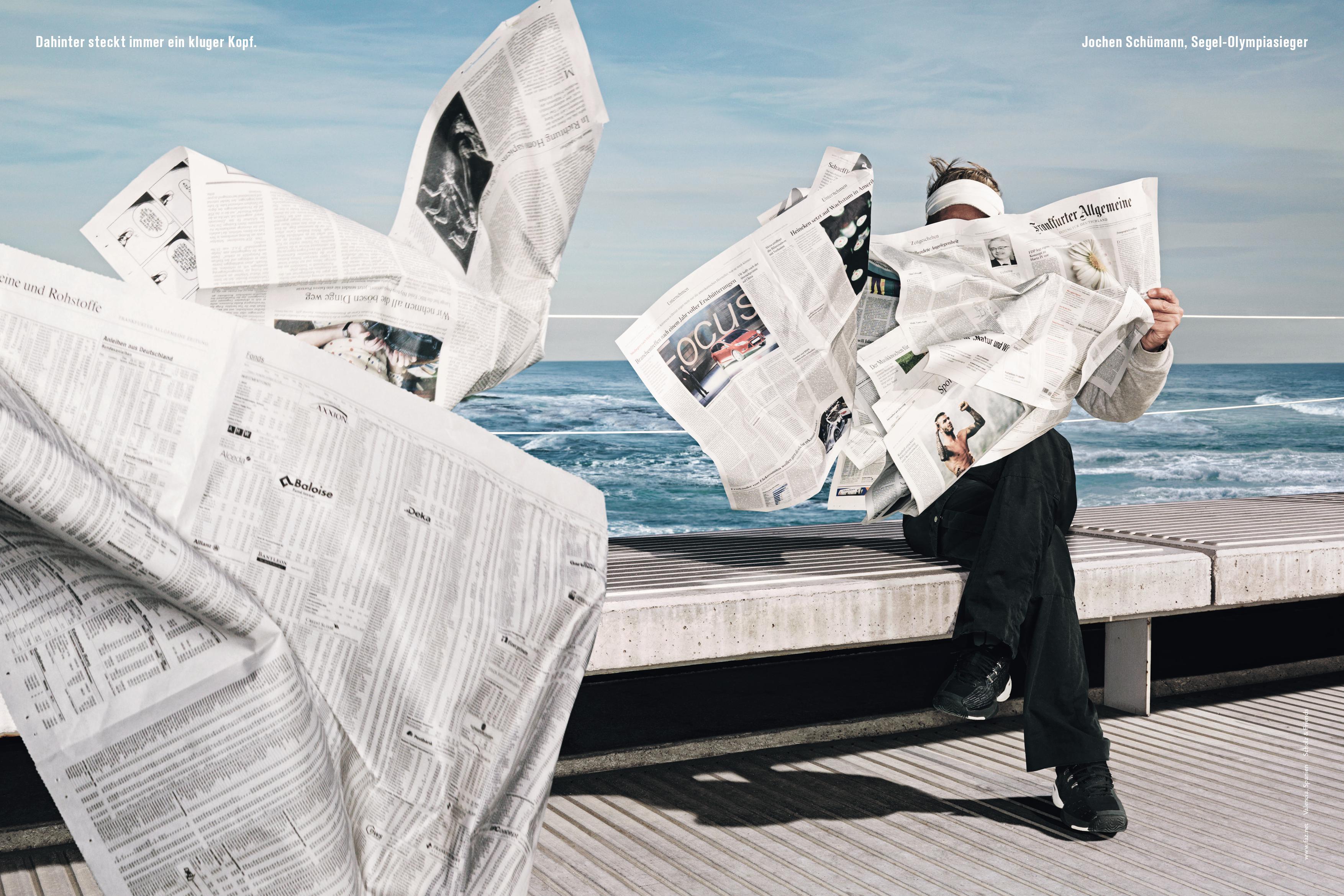 Auch Profisegler Jochen Schümann ärgert sich mal über einen kräftigen Wind - allerdings wohl nur dann, wenn die Böe den mehrfachen Olympiasieger beim Zeitunglesen im Hafen erwischt. Für das aktuelle Motiv der Kluge-Köpfe-Kampagne der Frankfurter Allgemeinen Zeitung hat sich Jochen Schümann hinter einer F.A.Z. ablichten lassen, deren Blätter durch eine Windböe ordentlich durcheinandergewirbelt werden.