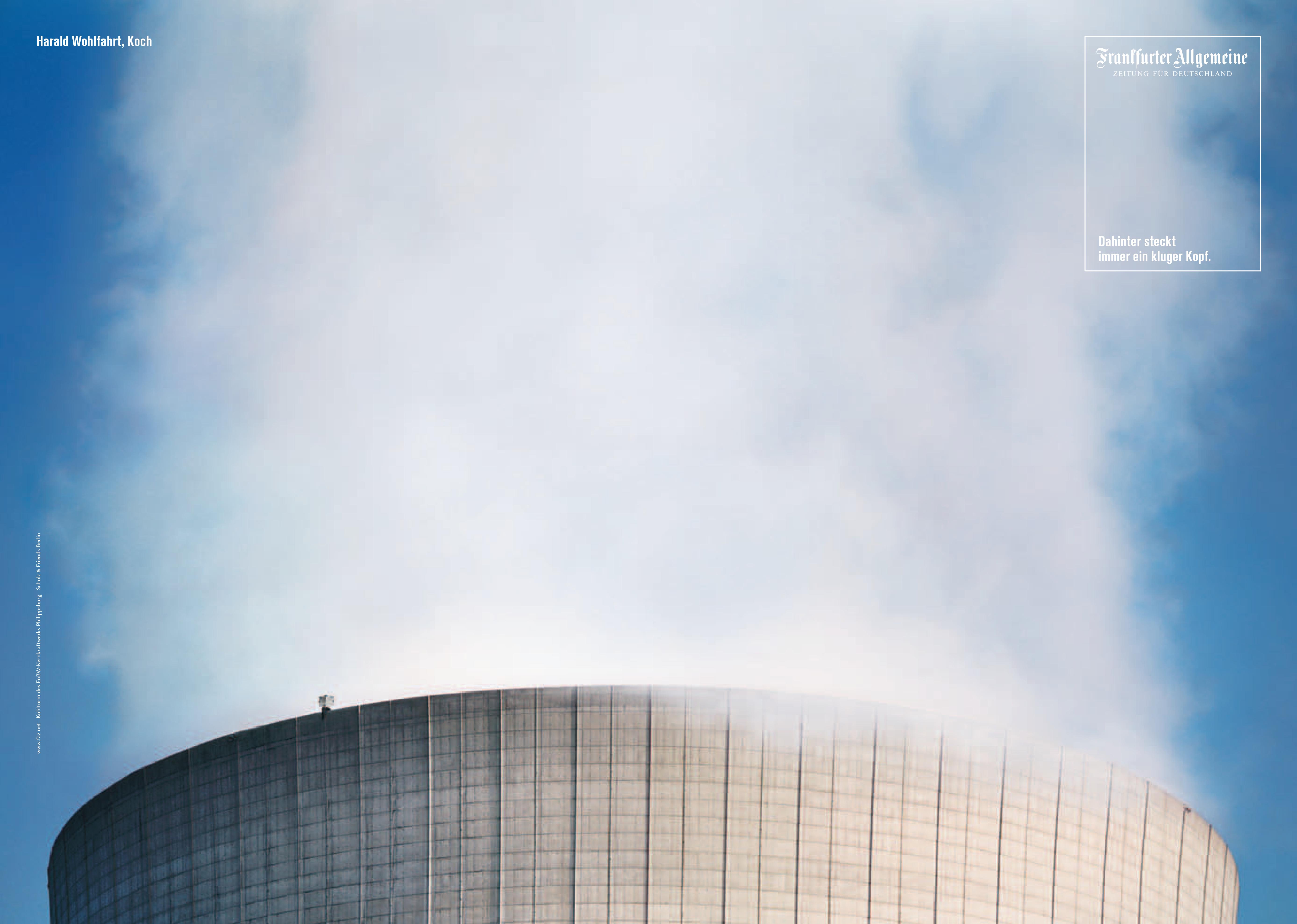 Für Deutschlands besten Koch Harald Wohlfahrt gehört Dampf zum Alltag in der Küche - doch nur selten in dieser Menge und schon gar nicht in schwindelerregender Höhe. Für das aktuelle Anzeigenmotiv der legendären F.A.Z.-Kampagne setzt Scholz & Friends Berlin den Spitzenkoch an den Rand eines riesigen Kochtopfs: auf einen Kühlturm im Badischen.