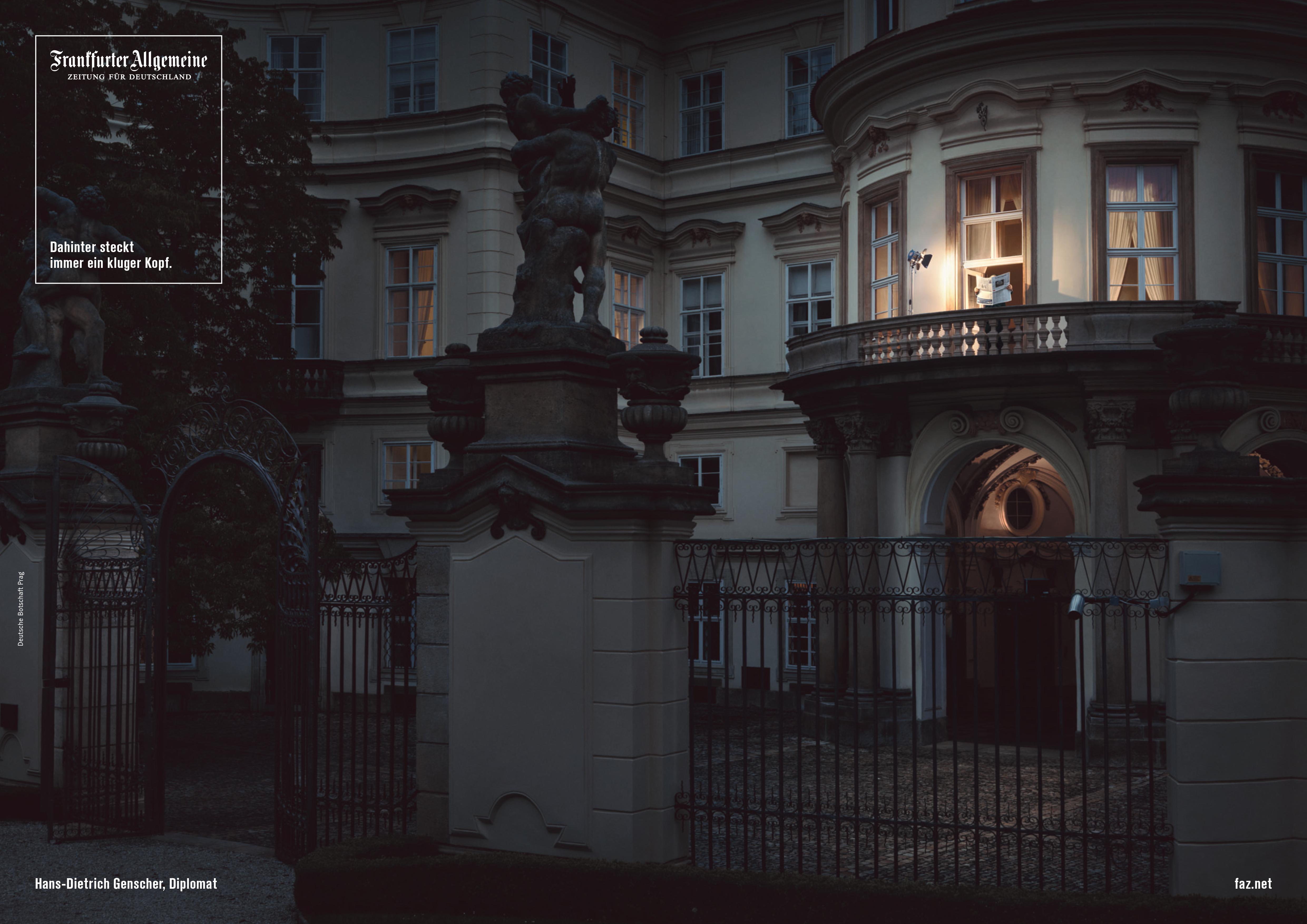Das neue Motiv der Fotoserie „Dahinter steckt immer ein kluger Kopf“ der F.A.Z. erinnert an die berühmten TV-Aufnahmen, die am 30. September 1989 von Prag aus um die Welt gingen. Das Palais Lobkowicz ist umhüllt von Dunkelheit, allein ein Scheinwerfer beleuchtet Teile des Balkons. Wo damals Hans-Dietrich Genscher zu den DDR-Flüchtlingen sprach, liest er nun die F.A.Z. Der Innenhof der Botschaft, auf dem sich vor 25 Jahren die Menschen drängten und sie die Ansprache des Bundesaußenministers erwarteten, ist leer.