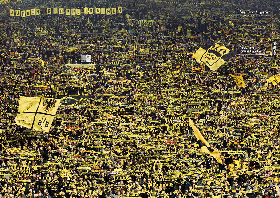 Auf der Südtribüne schlägt das Herz des BVB. Fans schwenken Fahnen, halten Schals hoch, singen Hymnen und mittendrin: Jürgen Klopp. Für die Fotoserie „Kluge Köpfe“ hat sich der Meistertrainer hinter einer Ausgabe der F.A.Z. fotografieren lassen.