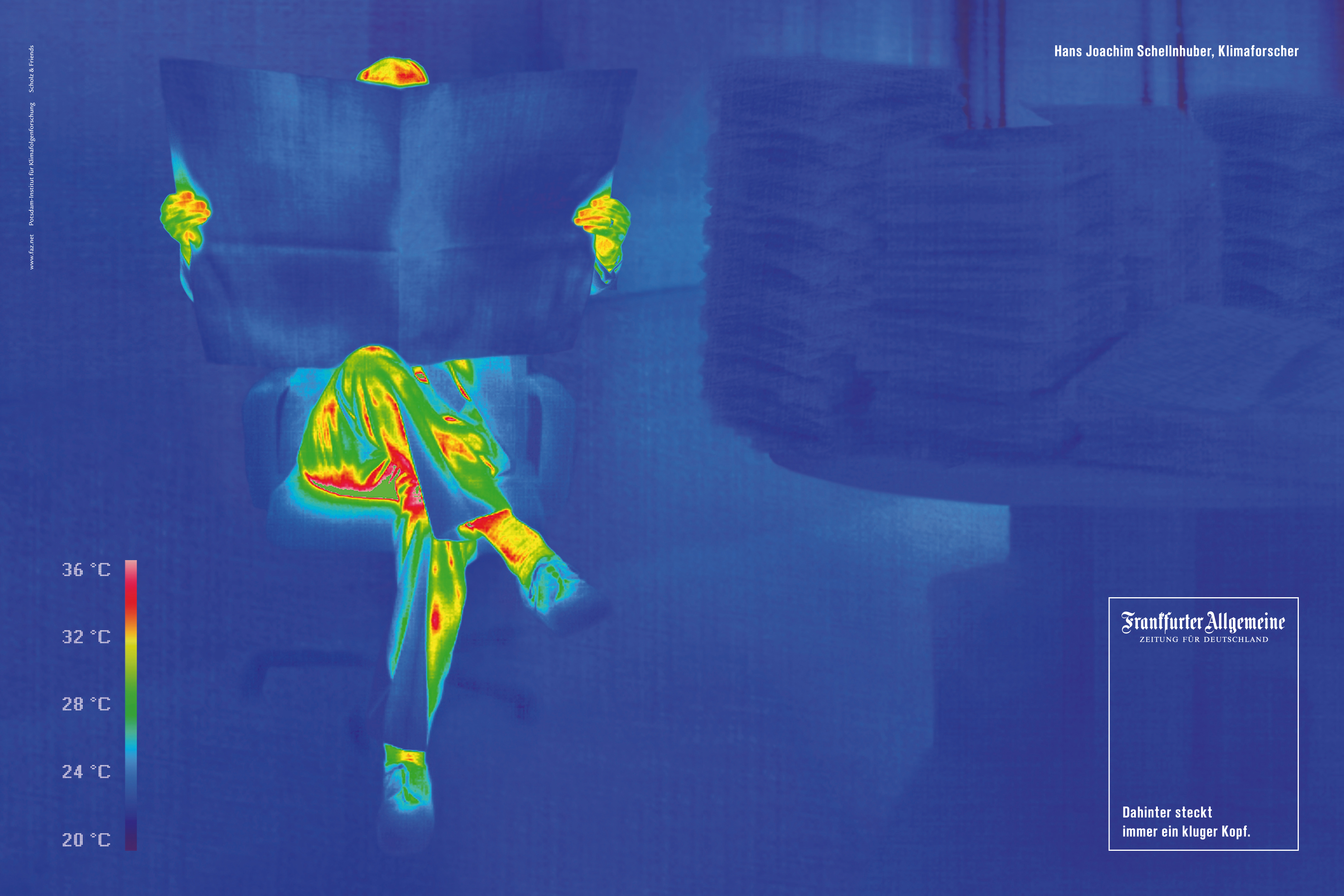 Deutet seine rote Stirn etwa darauf hin, dass die Gedanken von Professor Hans Joachim Schellnhuber im Vorfeld der Kopenhagener Klimakonferenz heiß gelaufen sind? Zumindest zeigt die Farbe, dass der Wissenschaftler an dieser Stelle wohltemperiert ist: Für das aktuelle Motiv der F.A.Z.-Kampagne hat Scholz & Friends den Klimaberater der Bundesregierung mit einer speziellen Wärmebildkamera abgelichtet.