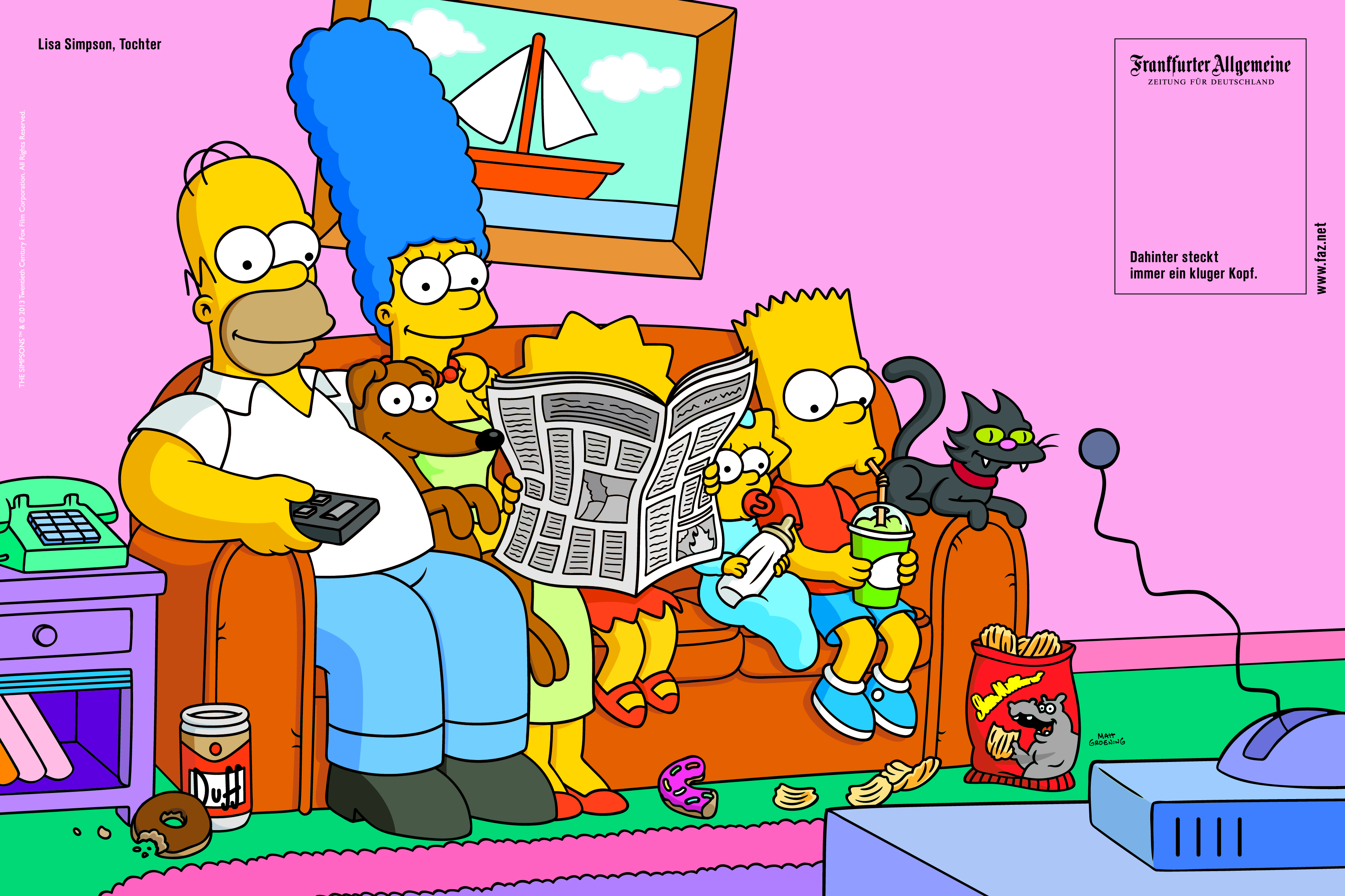 Es ist ein Bild, das Millionen Fans kennen und lieben: die Simpsons auf dem Sofa, vereint vor dem heimischen Flimmerkasten. Doch während der Rest der berühmten Fernsehfamilie gebannt dem TV-Programm folgt, geht Lisa Simpson demonstrativ einer anderen Leidenschaft nach: Sie liest die F.A.Z.. Für das neue Motiv der „Kluge Köpfe“-Fotoserie verbirgt sich die intelligenteste Achtjährige der Welt hinter einer Ausgabe der Frankfurter Allgemeinen Zeitung.