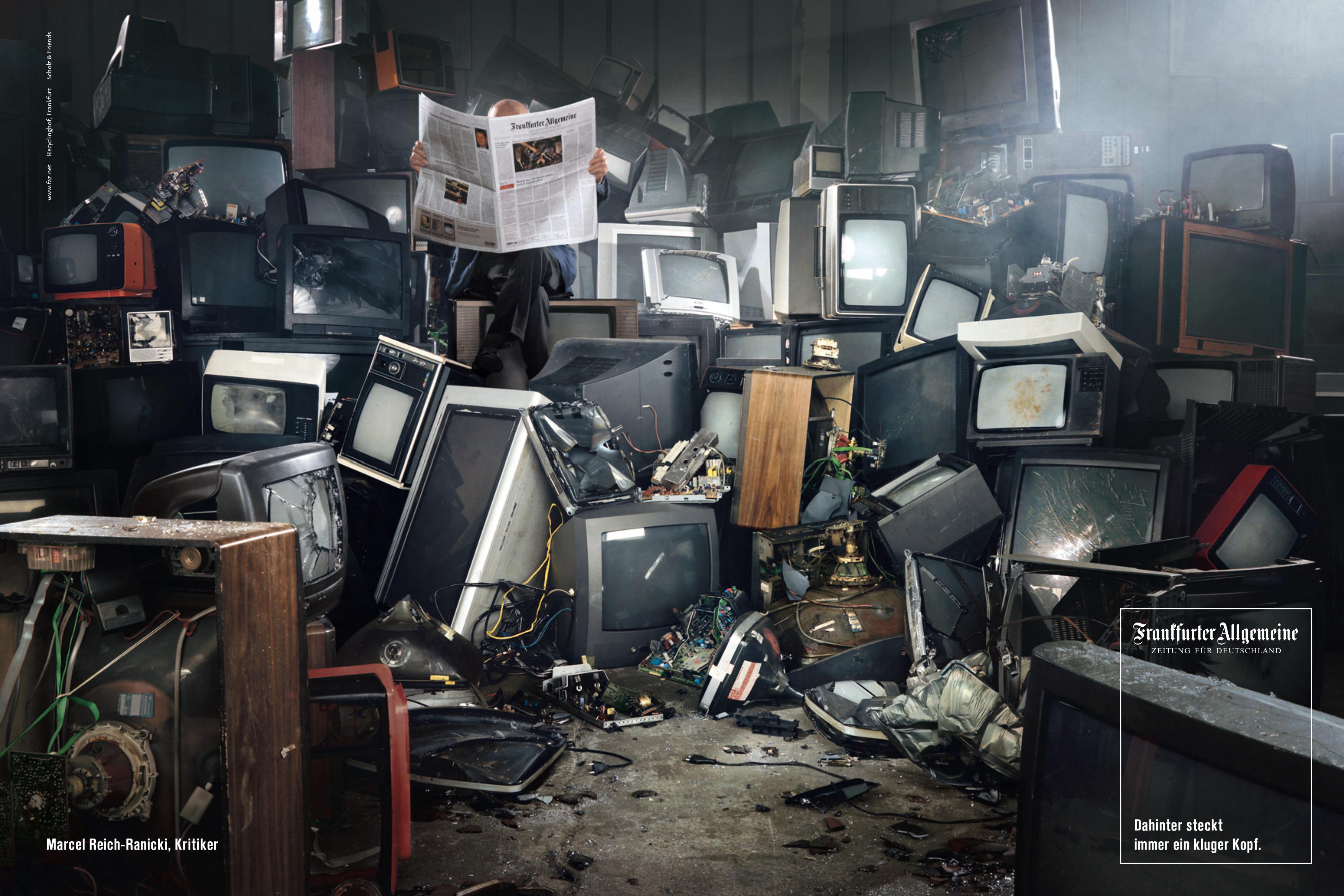 Hier dürfte sich Marcel Reich-Ranicki so richtig wohl fühlen - für die aktuelle Kluge-Köpfe-Kampagne hat die F.A.Z. ihren ehemaligen Chef des Literaturteils an einen Ort gebracht, an dem ihn kein schlechtes Fernsehprogramm stört: auf einen Frankfurter Recyclinghof. Umgeben von ausrangierten Fernsehern kann sich der 88-jährige Literaturpapst auf dem Frankfurter Recyclinghof ungestört der F.A.Z.-Lektüre widmen. Wenige Wochen zuvor hatte Marcel Reich-Ranicki das deutsche TV-Programm als „Blödsinn“ abgestempelt und den Deutschen Fernsehpreis für sein Lebenswerk abgelehnt.