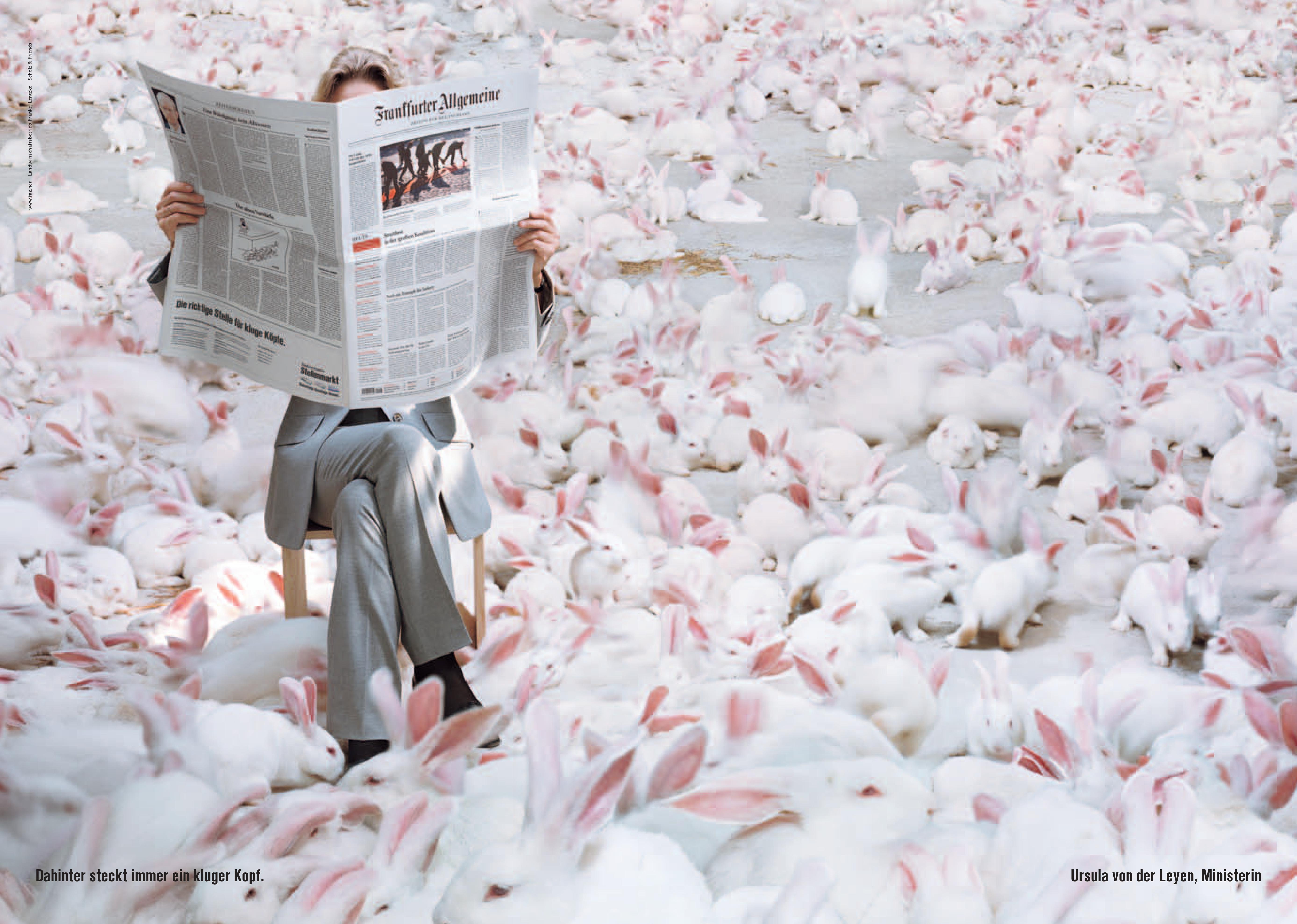 Die Ministerin für Familien und damit Nachwuchs ist der kluge Kopf im aktuellen Anzeigenmotiv der F.A.Z.-Kampagne. Der Spass bei den Aufnahmen in Lentzke war groß, denn die Tiere waren ähnlich schwer zu kontrollieren wie politische Freunde und Feinde. Die Ministerin trug es, wie man sieht, mit Humor.