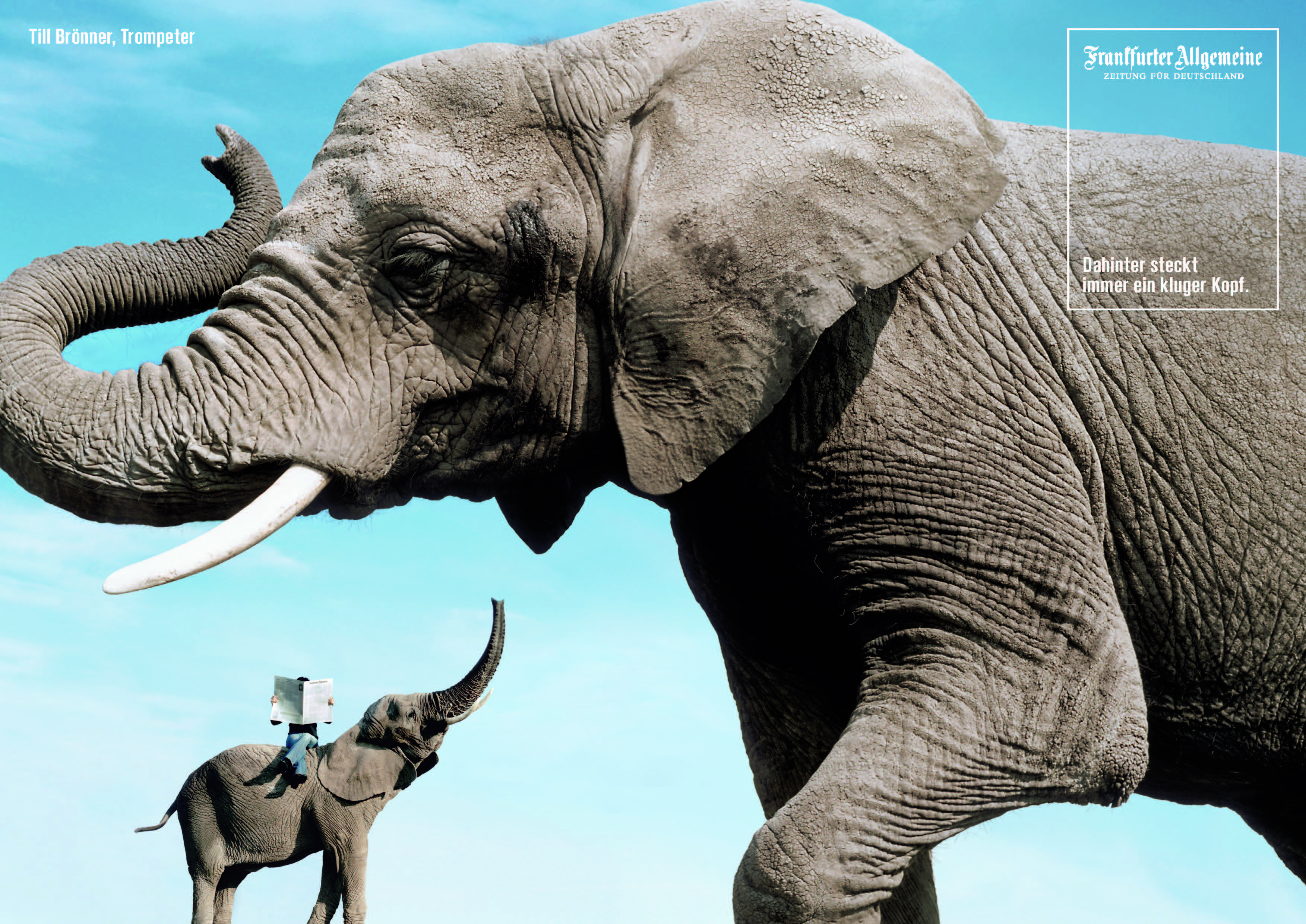 In so einem Bläsertrio ist selbst der international weit herumgekommene Startrompeter Till Brönner noch nie aufgetreten. Das aktuelle Anzeigenmotiv für die legendäre F.A.Z.-Kampagne zeigt ihn im Kreise zweier gewichtiger, tierischer Kolleginnen der beiden Elefantendamen Miri und Betty. Brönner und die beiden Elefanten sind ein neuer musikalischer Höhepunkt in der Klugen-Kopf-Kampagne. Zuvor waren bereits Kurt Masur, Yehudi Menuhin und Albert Mangelsdorff hinter der Zeitung aus Frankfurt.